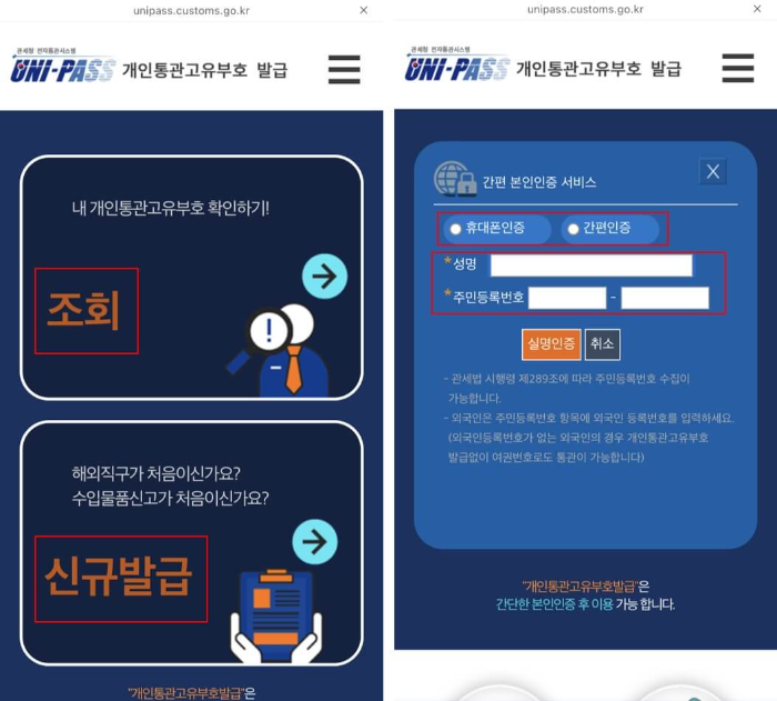모바일 개인통관고유부호 발급도 같은 방법으로 하시면 됩니다.