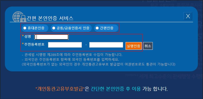 개인통관고유부호 조회 및 발급을 위해서는 본인인증이 필요합니다.
