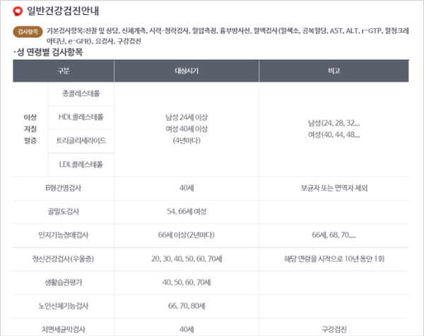 건강검진 항목은 기본 항목과 성별 및 연령별에 추가되는 항목이 있습니다.