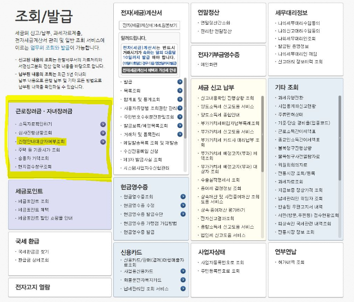 조회/발급 페이지에서 근로장려금, 자녀장려금 메뉴가 가장 눈에 띕니다. 해당 메뉴 중 '신청안내대상자여부조회'를 누릅니다.