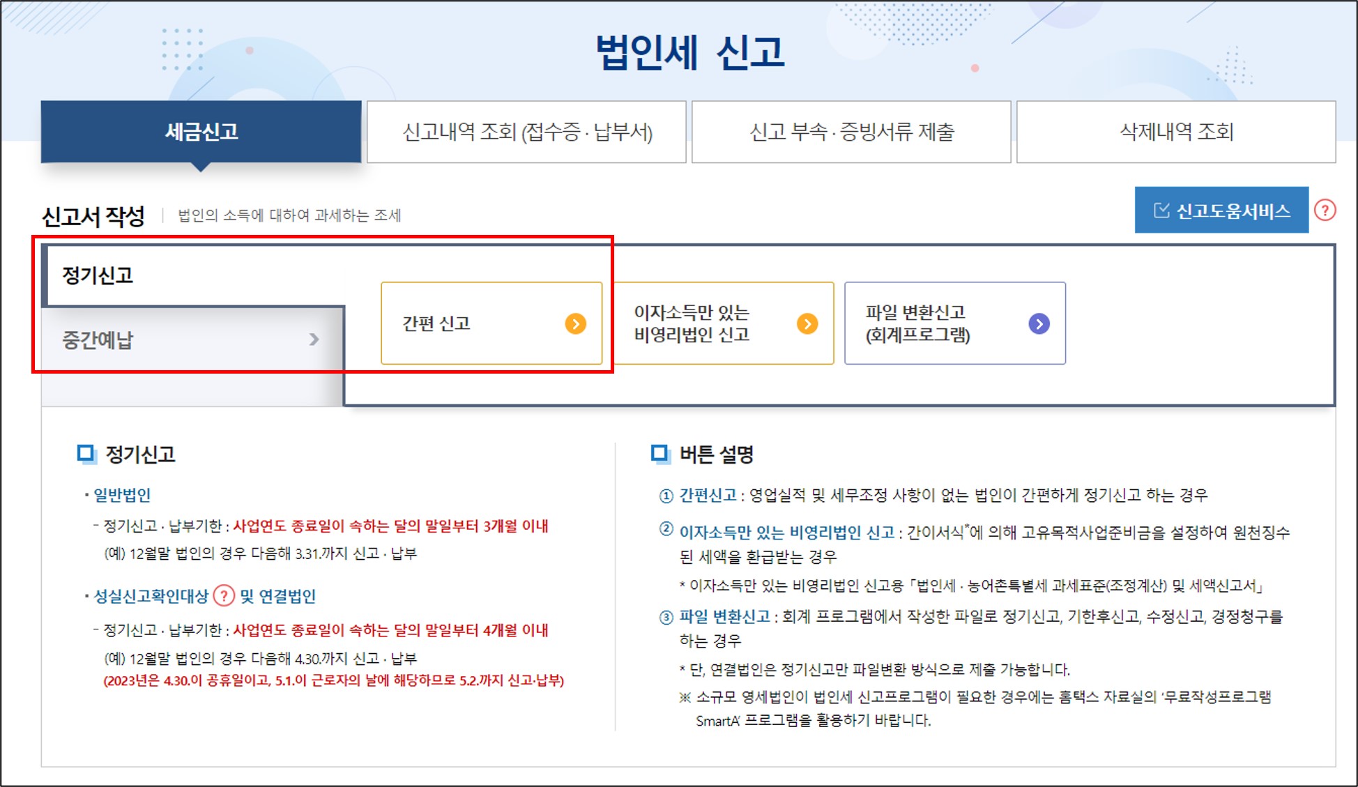 정기 신고 중 간편 신고는 영업실적과 세무조정 사항이 없는 법인의 경우 간편하게 정기 신고를 할 수 있도록 한 것입니다.
