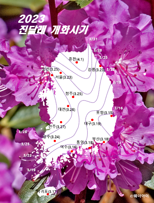 서울 경기권은 3월 23일부터 29일까지 진달래 개화를 만날 수 있습니다.