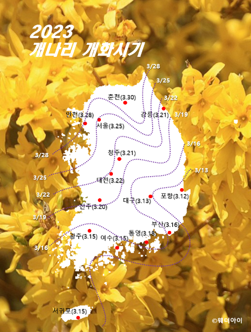 개나리 개화는 대구와 포항 지역이 2023년 3월 12일과 13일로 가장 먼저 예상됩니다. 이어 서귀포와 여수, 광주 지역에서 2023년 3월 15일 개화 예정입니다.