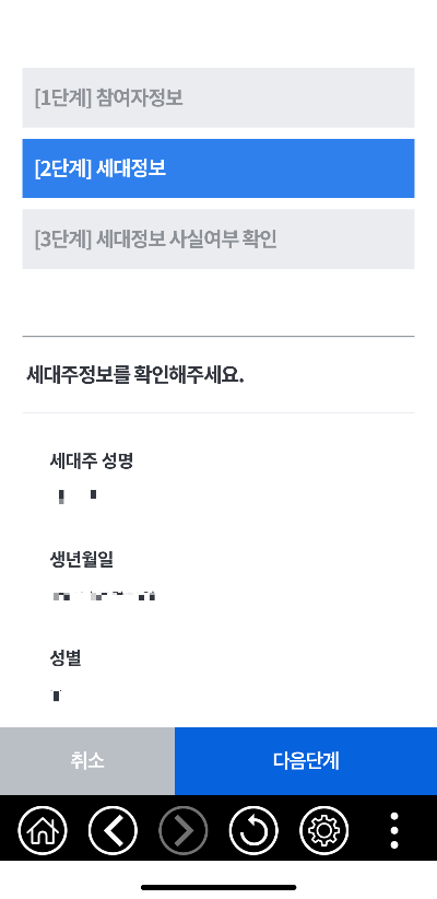 ✅[ 1단계 참여자정보 확인 > 2단계 세대정보 확인 > 3단계 세대정보 사실여부] 확인을 합니다.