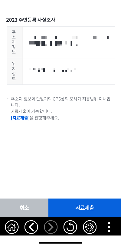 ✅ 3단계까지 완료하면, GPS 정보로 현 위치를 주소로 변환하고 등록한 거주지 주소와 일치하거나 오차가 허용범위 내라면 자료 제출이 가능하다는 안내가 나옵니다.