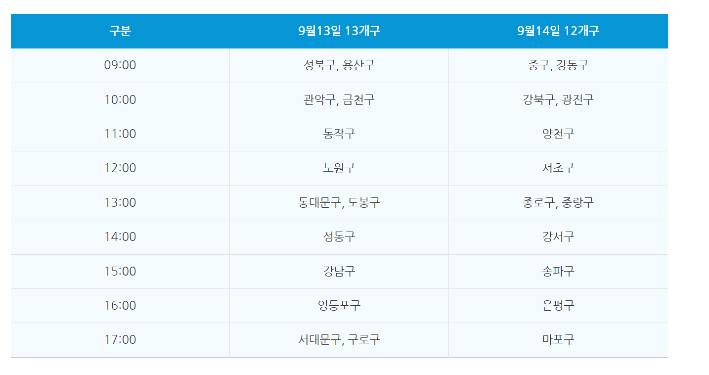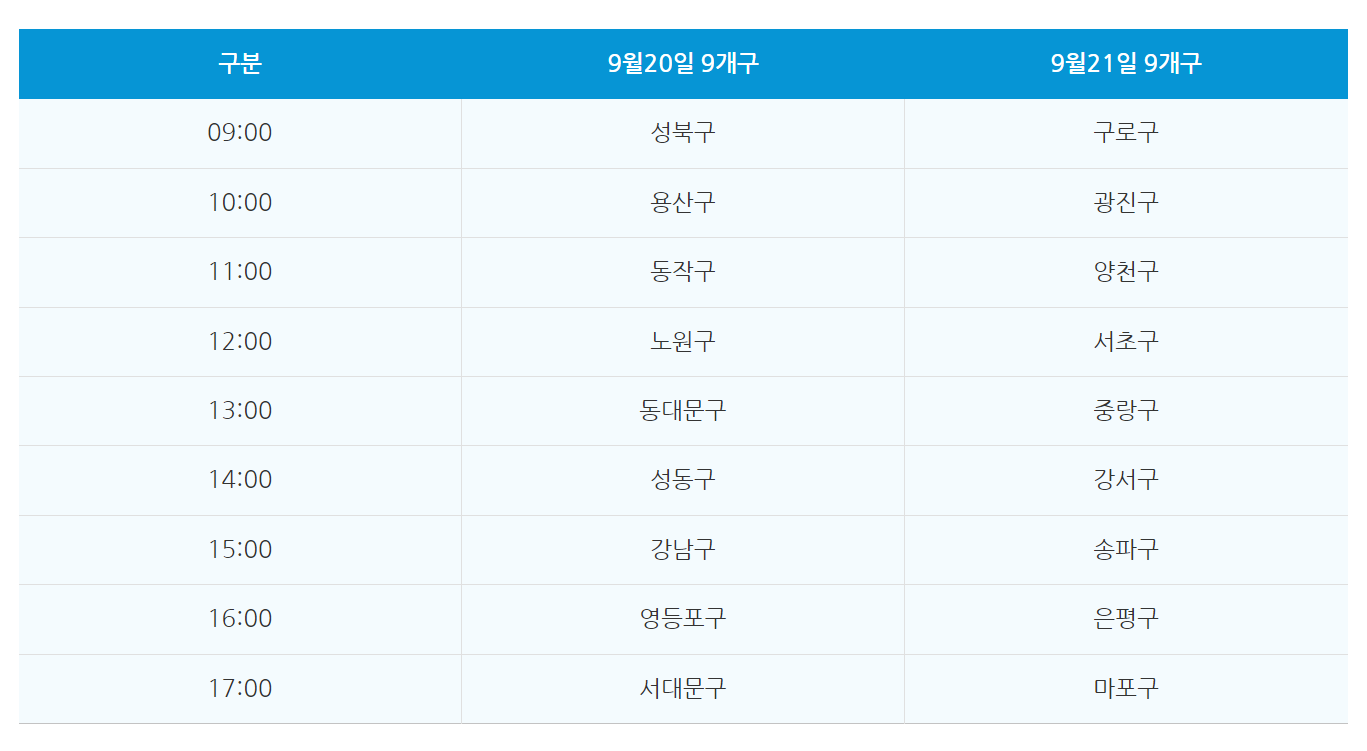 9월 20일과 21일 2일에 걸쳐 오전 9시부터 오후 5시까지 진행되니 아래 구별 발행일정 표를 잘 확인하시기 바랍니다.
