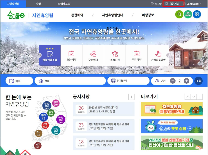 전국 자연휴양림 숙박 예약을 위해서는 먼저 숲나들e 회원가입이 필요합니다.