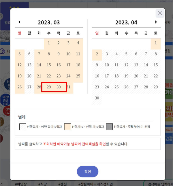 * 날짜는 각 자연휴양림마다 예약 가능 시기가 다를 수 있습니다. 예약 가능 날짜만 선택할 수 있습니다.