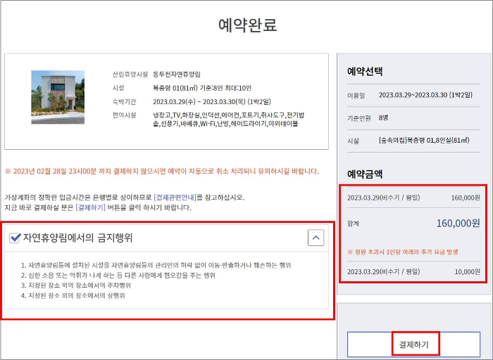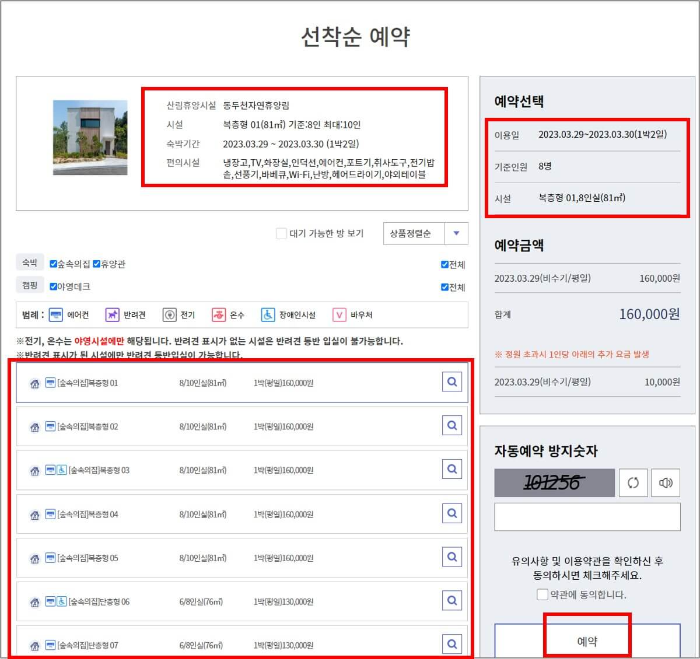 4) 기준 인원 및 비용, 이용일 확인 후 자동예약방지숫자 입력, 약관 동의 후 예약하기를 선택합니다.