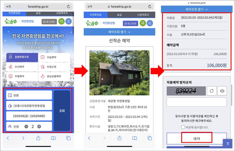 저는 자연휴양림 예약 시 숲나들e 모바일 홈페이지에서 자주 하고 있습니다.
