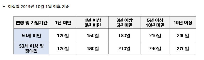 만약 이직일이 2019년 10월 1일 이후라면 아래 기간 동안 실업급을 받으실 수 있습니다.