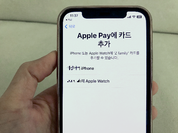 애플페이에 카드를 추가하는 것은 제 아이폰과 애플워치가 가능하다고 안내됩니다.