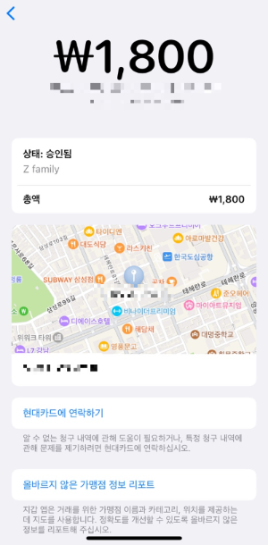 문자를 받은 후 애플페이 결제를 하면 위와 같이 결제 내역을 앱에서 확인할 수 있습니다.