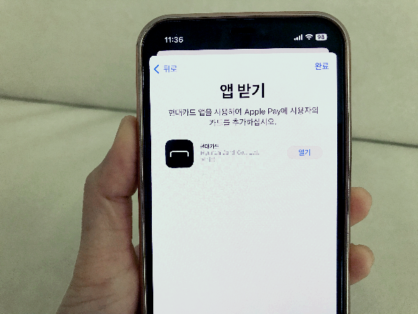 그러면 바로 현대카드 앱으로 이동하면서 등록된 카드 중 애플페이에 등록할 카드를 선택하라고 합니다. 실물 현대카드는 필요가 없었습니다. 다시 지갑에 카드를 넣고 애플페이 현대카드 등록을 진행했습니다.