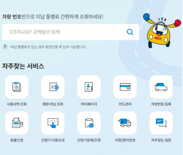 고속도로 통행료 공식 홈페이지에 들어가면 메인 화면에 차량 번호 입력 후 바로 미납 통행료를 조회할 수 있습니다.