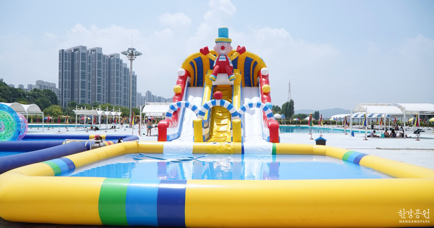 잠원 한강 수영장은 총 3개의 수조수가 있으며 에어바운스 등 아이들이 놀 수 있는 물놀이 놀이기구가 있습니다.