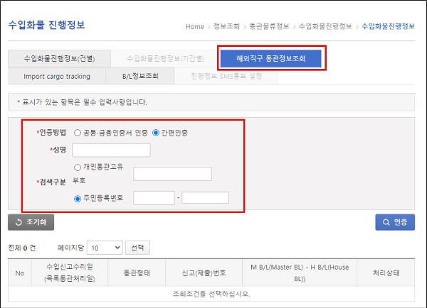 수입화물 진행정보 페이지에서 [해외직구 통관정보조회]를 선택하여