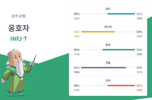저는 이번 mbti 성격 유형검사 무료 테스트 결과에서는 옹호자 INFJ-T 결과를 받았습니다. 이전의 결과에서는 E 유형이었는데 이번엔 I유형의 결과를 받아서 더욱 흥미로웠습니다.