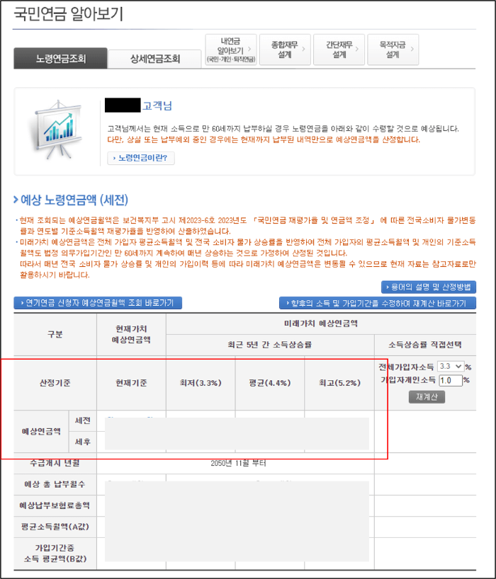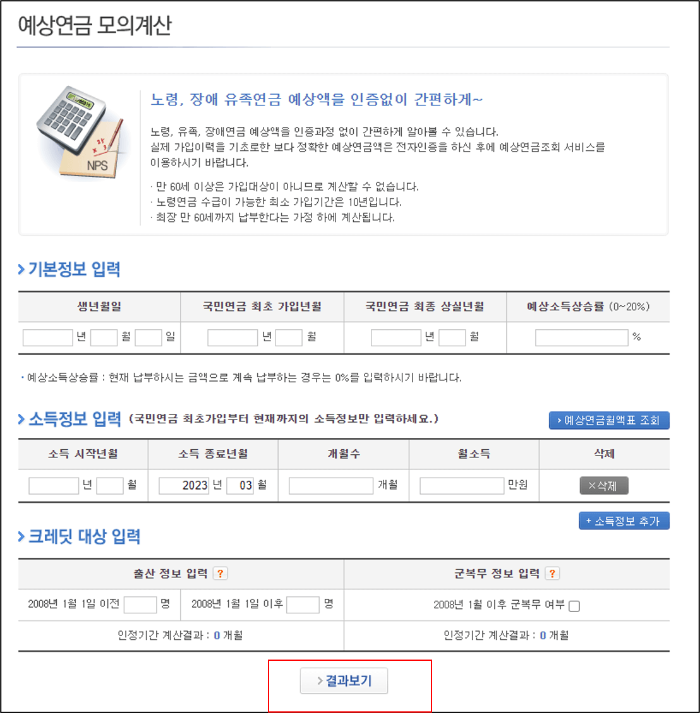 - 기본정보 기입 : 생년월일, 국민연금 최초 가입연월, 최종 상실년월, 예상소득상승률