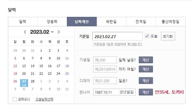 2월 27일을 기준으로 만나이 87년 10월생을 예시로 검색해보면 만35세 토끼띠로 만나이 계산기 결과를 확인할 수 있습니다.