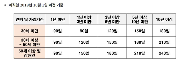 이직일이 2019년 10월 1일 이전이라면 아래 표에 따라 수급기간이 정해집니다.