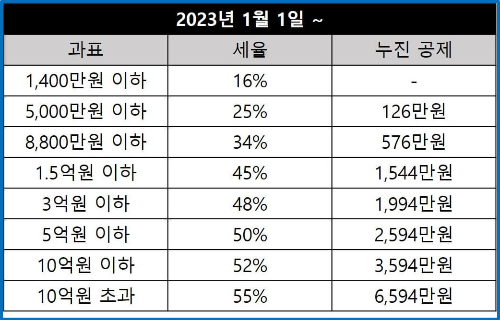 2023년 개정된 양도소득세율 표에 따르면 1,400만 원 이하는 6%, 5,000만 원 이하는 15%, 10억 초과 시 45%의 양도소득세율이 적용됩니다.
